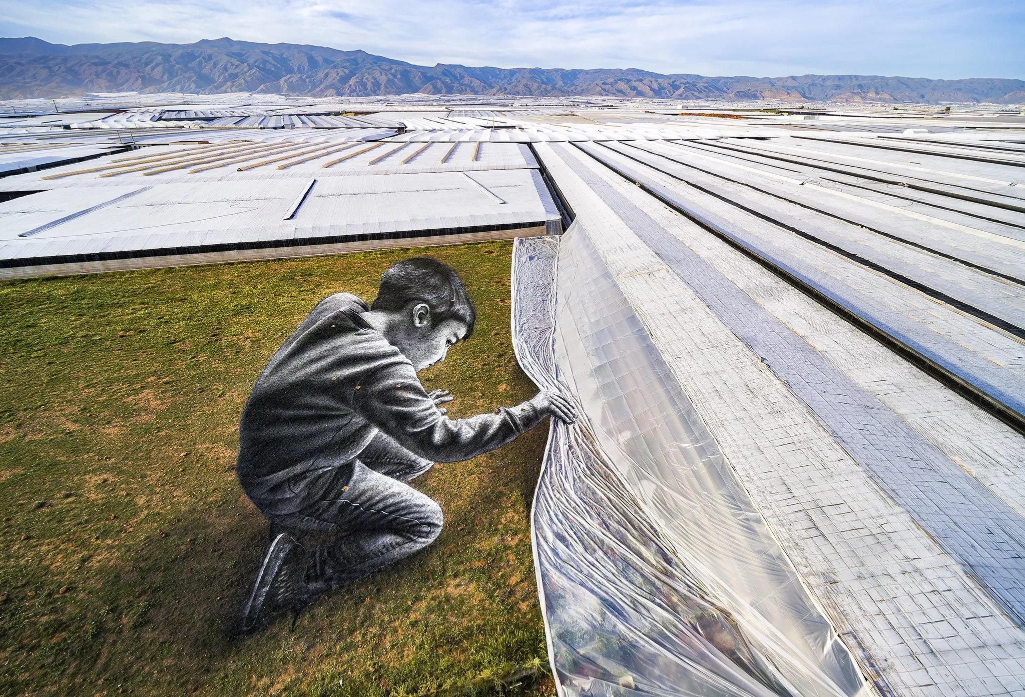 Genre : Réalisation d’une fresque monumentale au sol entre les serres agricoles (Land Art éphémère), accompagnée d’un reportage pour la télévision.